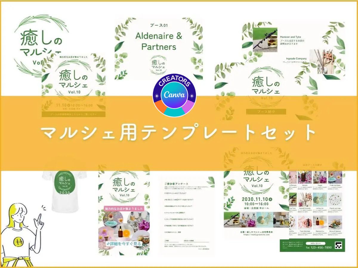 【無料】葉っぱ模様のマルシェシリーズCanvaテンプレート8個セット
