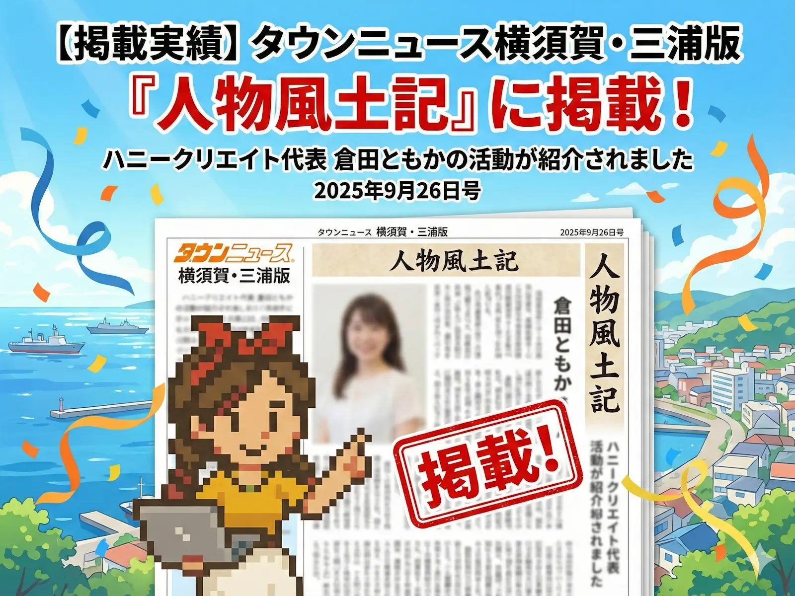 このたび、2025年9月26日発行の タウンニュース横須賀・三浦版 にて、人物紹介コーナー「人物風土記」に株式会社ハニークリエイト代表 倉田ともかの活動を取り上げていただきました。