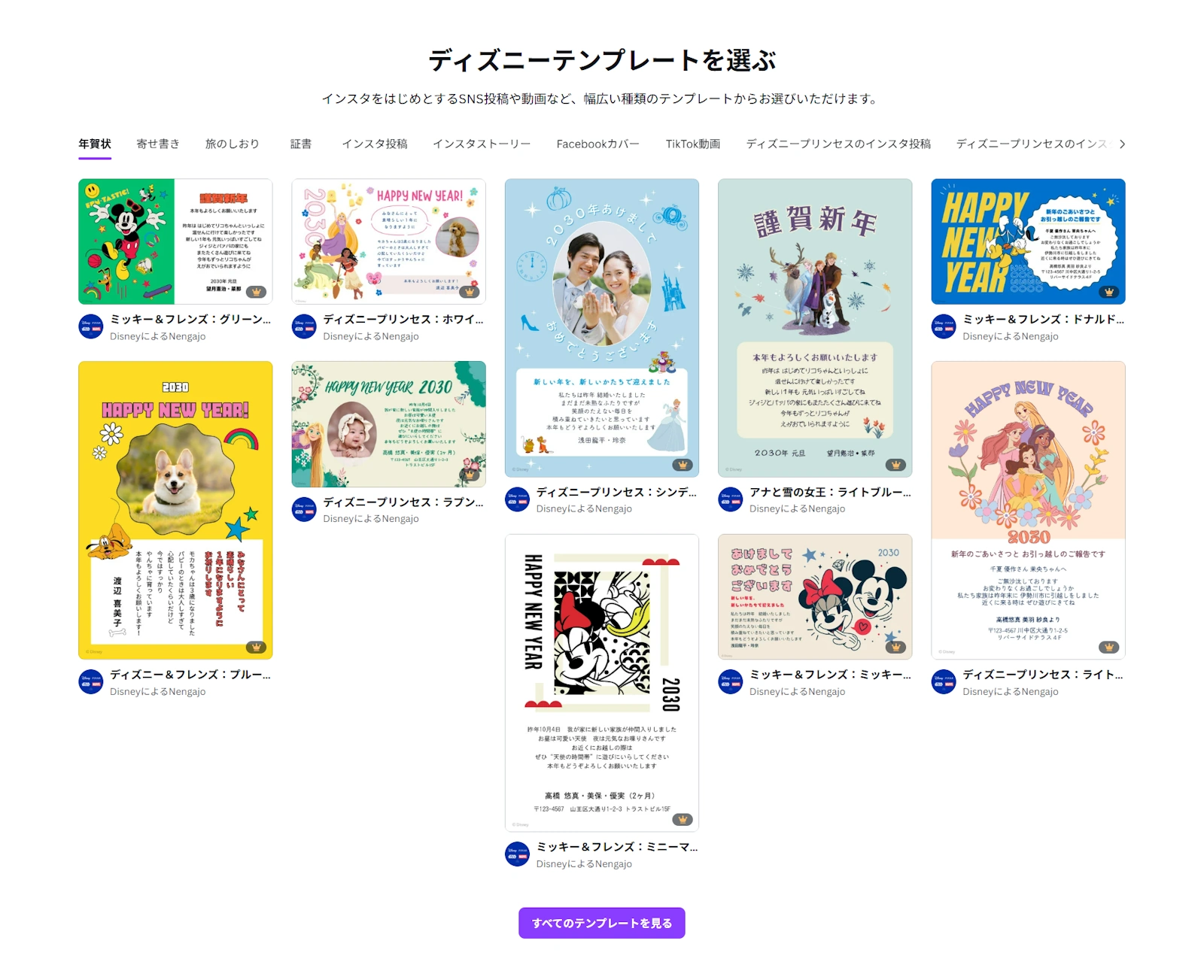 テンプレートを見てみると、和装のミッキーや、2030年(!)を見据えたような未来的なデザインまで、豊富に用意されています。写真を入れられるタイプもあるので、お子さんの写真とミッキーを並べる……なんて夢のコラボも、Canvaなら一瞬でできちゃいますね!