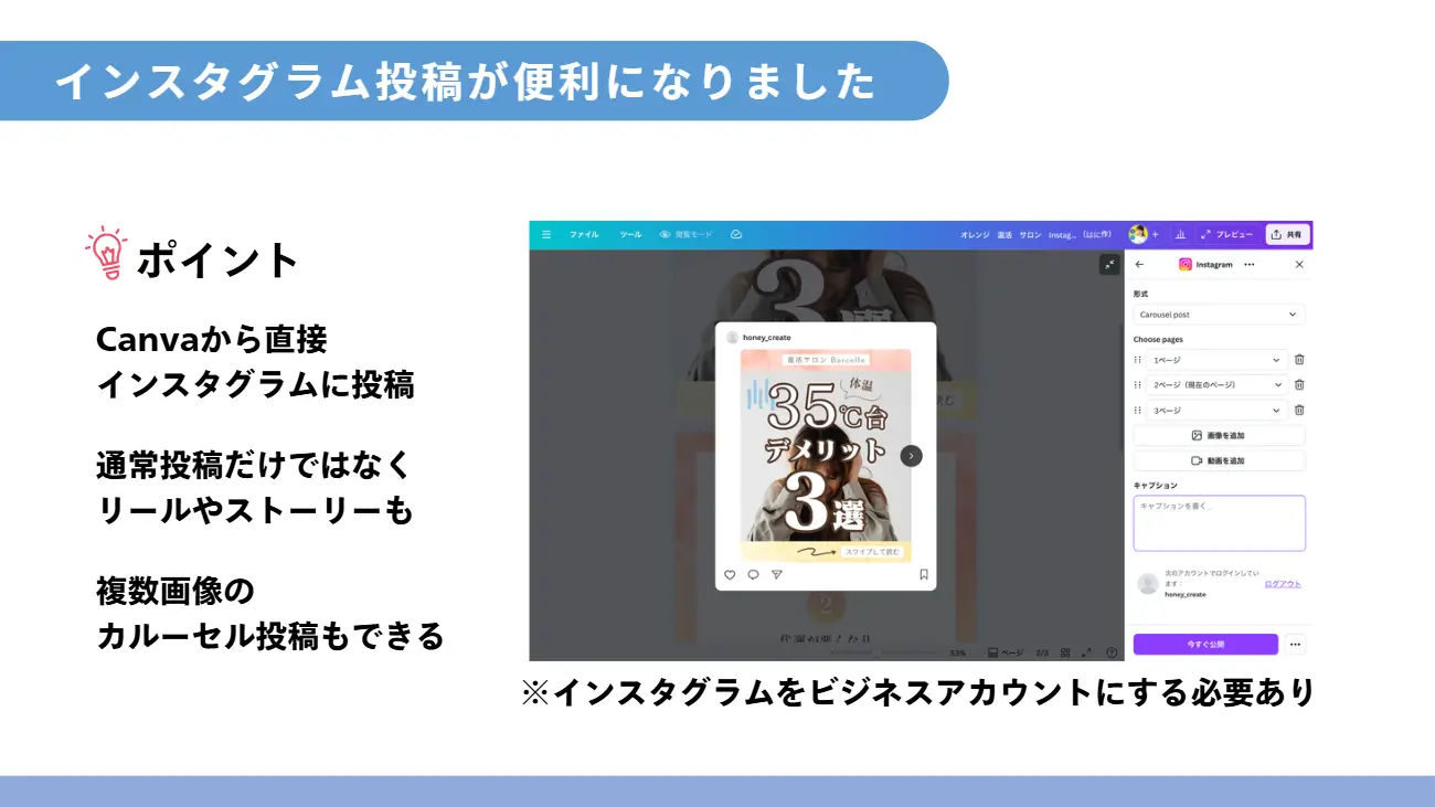 セミナーでは、「温活サロン」の事例を使い、CanvaのAIに「冬の冷え性対策についての投稿案を出して」とお願いする様子をお見せしました。