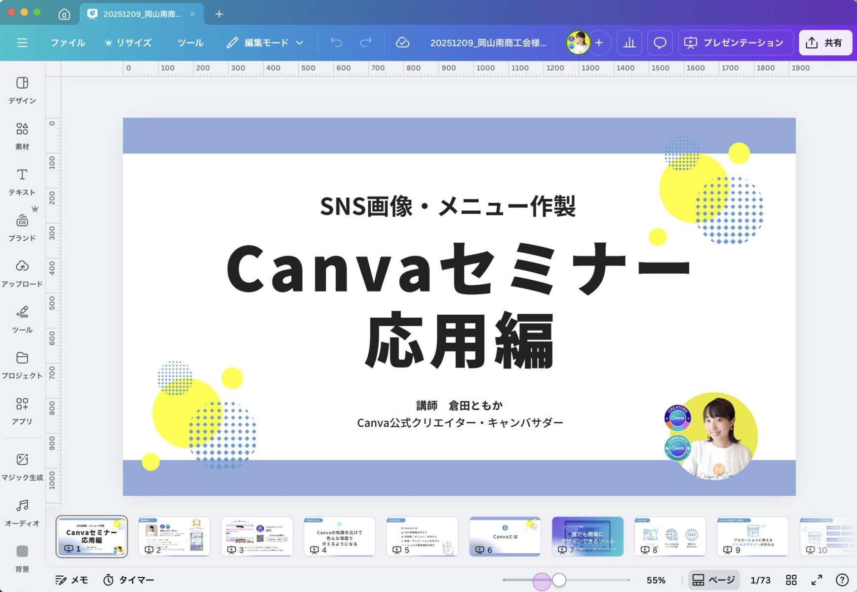 12月9日、岡山県の岡山南商工会様にて、「Canva活用セミナー(応用編)」の講師として登壇させていただきました!